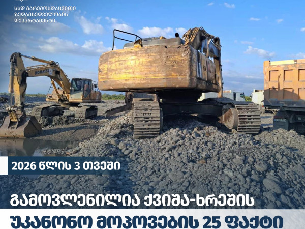 გარემოს დაცვისა და სოფლის მეურნეობის სამინისტროს გარემოსდაცვითი ზედამხედველობის დეპარტამენტის თანამშრომლებმა 2026 წლის 1 იანვრიდან 31 მარტის ჩათვლით ქვიშა-ხრეშის უკანონო მოპოვების 25 ფაქტი გამოავლინეს. მათგან 6 შემთხვევა სისხლის სამართლის დანაშაულის ნიშნებს შეიცავს.გამოვლენილი სამართალდარღვევების შედეგად გარემოსთვის მიყენებული ზიანის ოდენობა დაახლოებით 246 000 ლარს შეადგენს. მასალები შემდგომი რეაგირების მიზნით შესაბამის უწყებებში გადაიგზავნა. ამასთან, სამართალდამრღვევებს ჩამოერთვათ 13 ერთეული სპეციალური ტექნიკა.ქვიშა-ხრეშის უკანონო მოპოვება მნიშვნელოვან ზიანს აყენებს გარემოს. აღნიშნული საქმიანობა იწვევს მდინარეთა კალაპოტების დეფორმაციას, ნაპირების გამაგრების სისტემის დარღვევას, ნიადაგის ეროზიას და ზრდის დასახლებული პუნქტების დატბორვის, წარეცხვისა და წყლის დონის ცვლილების რისკებს, რაც საბოლოოდ ეკოსისტემების დეგრადაციას იწვევს.ბუნებრივი რესურსებით უკანონო სარგებლობის ფაქტების პრევენცია, აღკვეთა და გამოვლენა უწყების ერთ-ერთი პრიორიტეტია. დეპარტამენტის ეკიპაჟები ქვეყნის მასშტაბით 24-საათიან უწყვეტ პატრულირებას ახორციელებენ და სამინისტროს ცხელ ხაზზე (153) შემოსულ თითოეულ შეტყობინებაზე დაუყოვნებლივ რეაგირებენ.