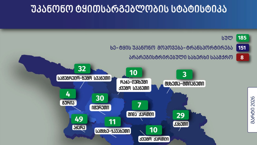გარემოს დაცვისა და სოფლის მეურნეობის სამინისტროს გარემოსდაცვითი ზედამხედველობის დეპარტამენტის თანამშრომლებმა, 2026 წლის 1 მარტიდან 31 მარტის პერიოდში, უკანონო ტყითსარგებლობის 185 ფაქტი გამოავლინეს.