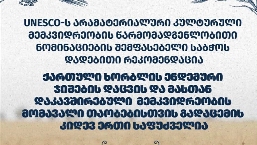 UNESCO-ს არამატერიალური კულტურული მემკვიდრეობის წარმომადგენლობითი ნომინაციების შემფასებელი საბჭოს მიერ "ქართული ხორბლის კულტურა: ტრადიციები და რიტუალები" დადებითი რეკომენდაცია გაიცა. საბოლოო განხილვა UNESCO-ს არამატერიალური კულტურული მემკვიდრეობის დაცვის მთავრობათაშორისი კომიტეტის მე-20 სესიაზე შედგება, რომელიც 8-13 დეკემბერს ინდოეთში, დელიში გაიმართება.